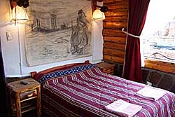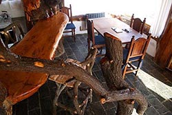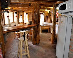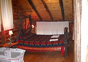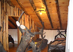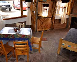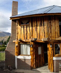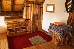 Cabaña para 4 personas construida y diseñada con materiales rústicos de la zona. Dos dormitorios: uno matrimonial con cuna para bebé y un amplio ventanal con balcón y hermosa vista, otro dormitorio con camas simples, ambos en planta alta. En planta baja, comedor, desayunador y cocina.